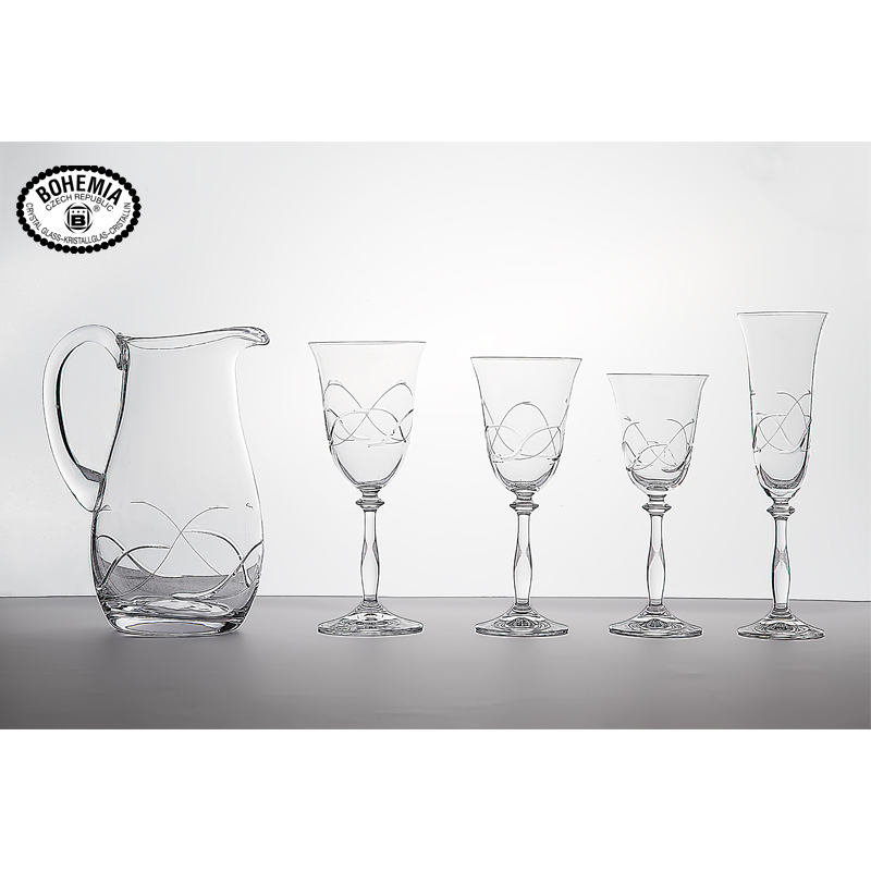 Cristaleria bohemia angela 2. Fabricada en cristal de bohemia y tallada con el modelo talla 2.Un modelo de talla moderna y actual realizada de una forma completamente artesanal y que consiste en unos cortes pulidos en forma de ese acompañados por un fino hilo mate terminado en forma de ese. Esta preciosa cristalería de 12 servicios se puede completar con cualquier pieza como vasos altos , bajos o cubo de hielo tallado con el mismo modelo